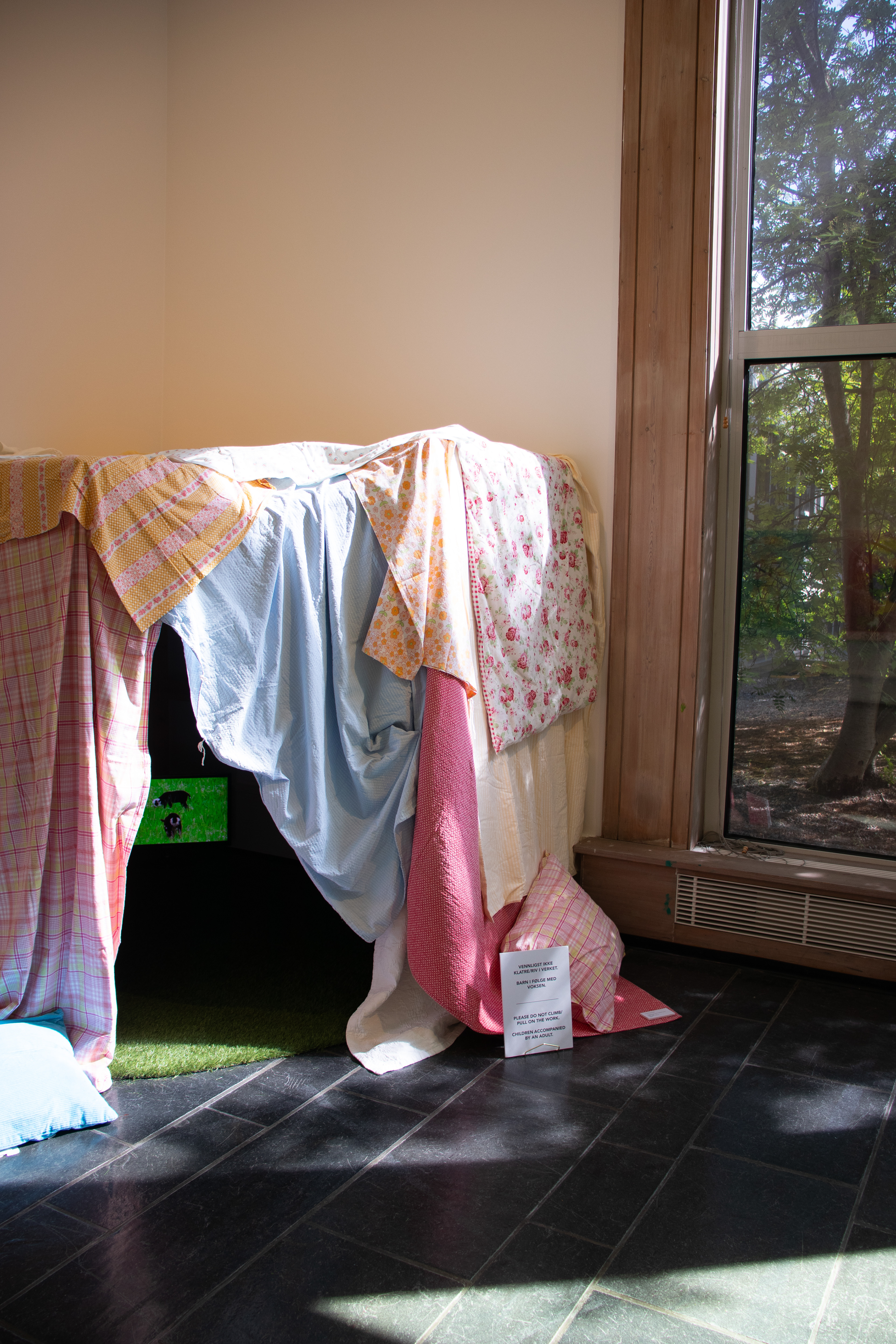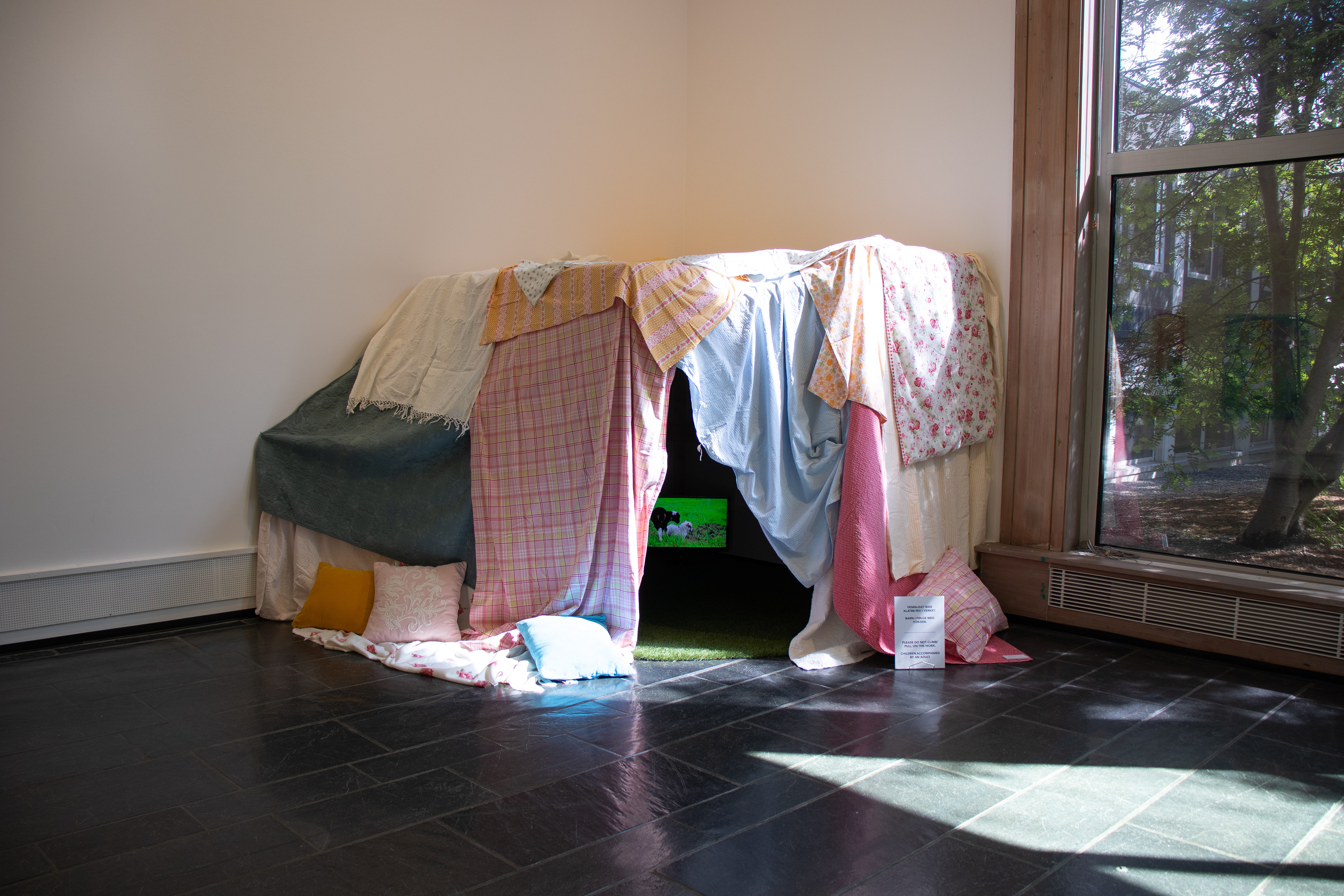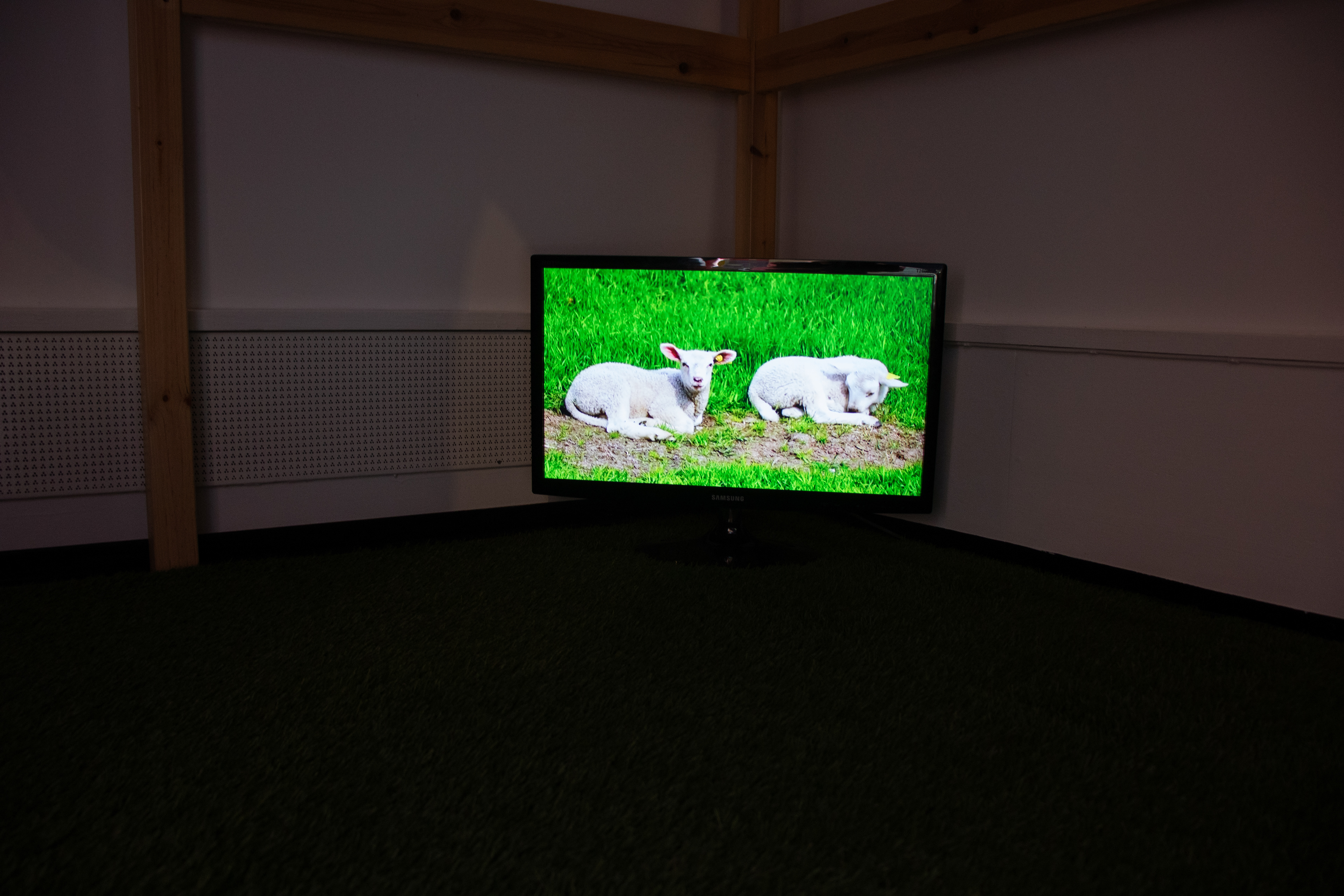 2024. Installasjon av treverk, tekstiler, kunst-gress og video. 260 x 250 x 190 cm.