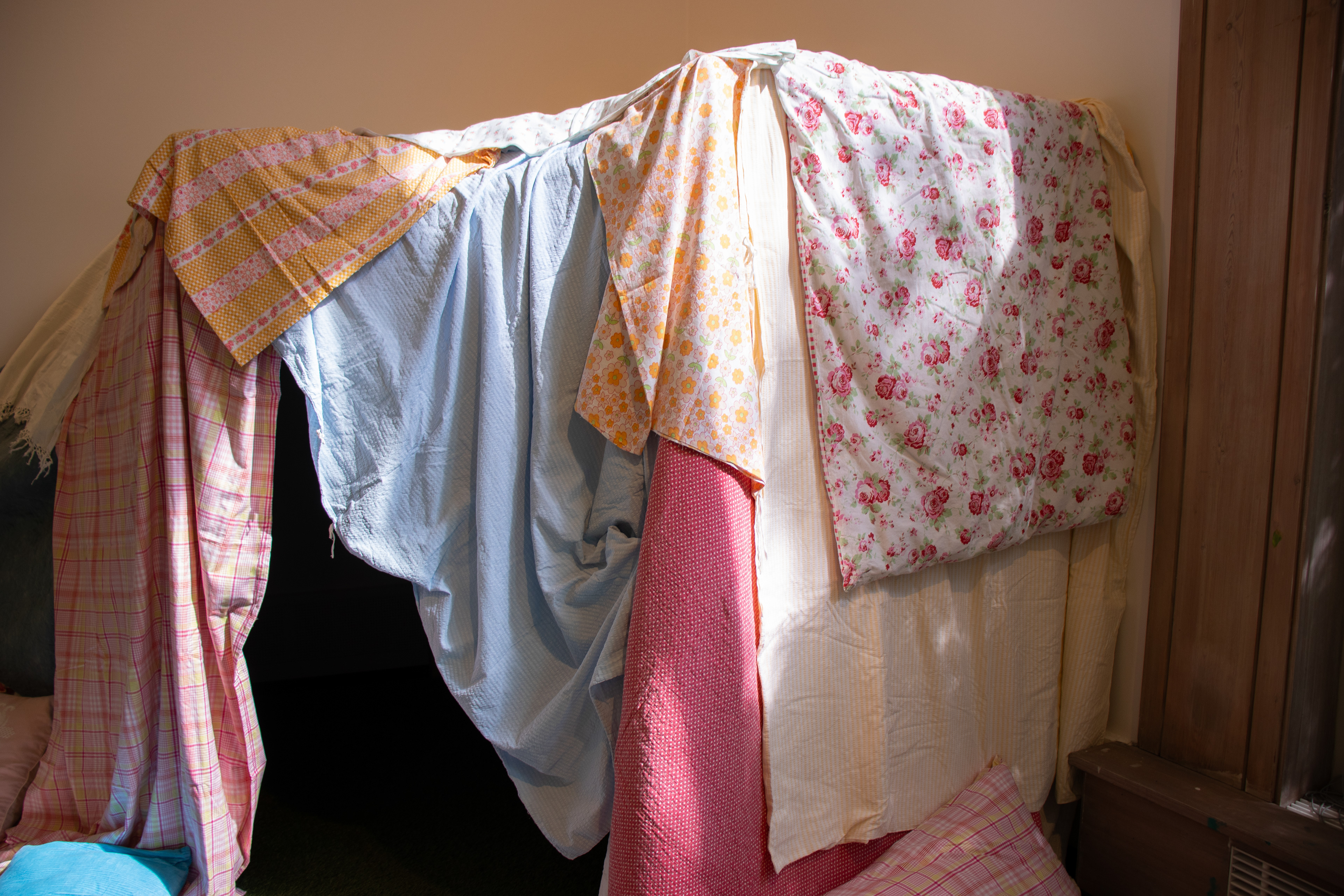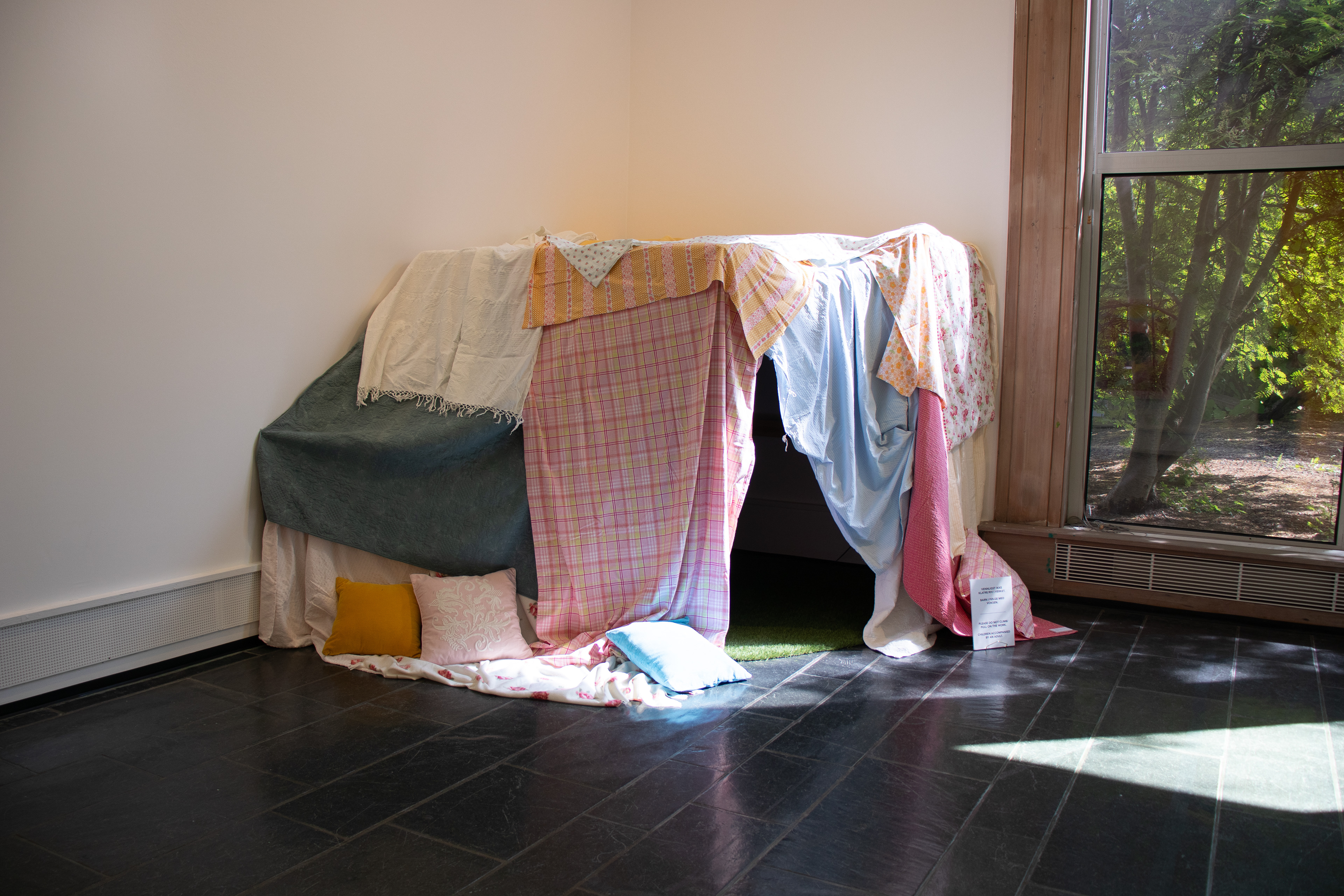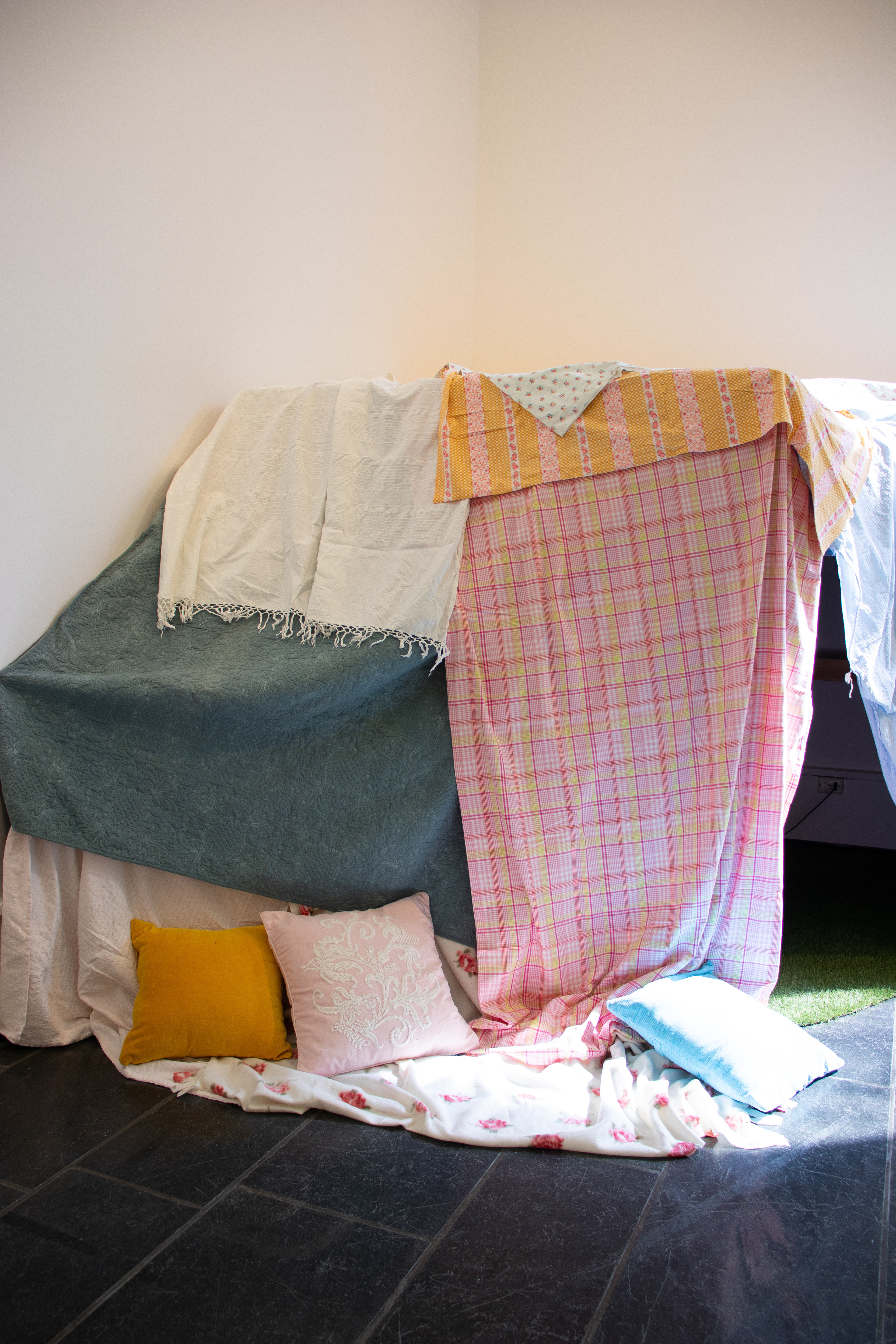 2024. Installasjon av treverk, tekstiler, kunst-gress og video. 260 x 250 x 190 cm.