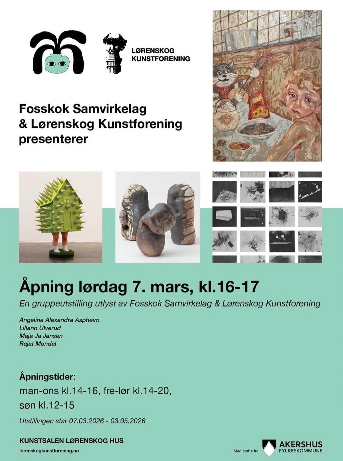 Juryert gruppeutstilling på Lørenskog Kunstforening, arrangert av Fosskok Samvirkelag, 7. mars - 3. mai 2026. Deltok med verkene House Arrest #3 (Disco), House Arrest #4 (Rash), House Arrest #5 (Spikes), og Detached.