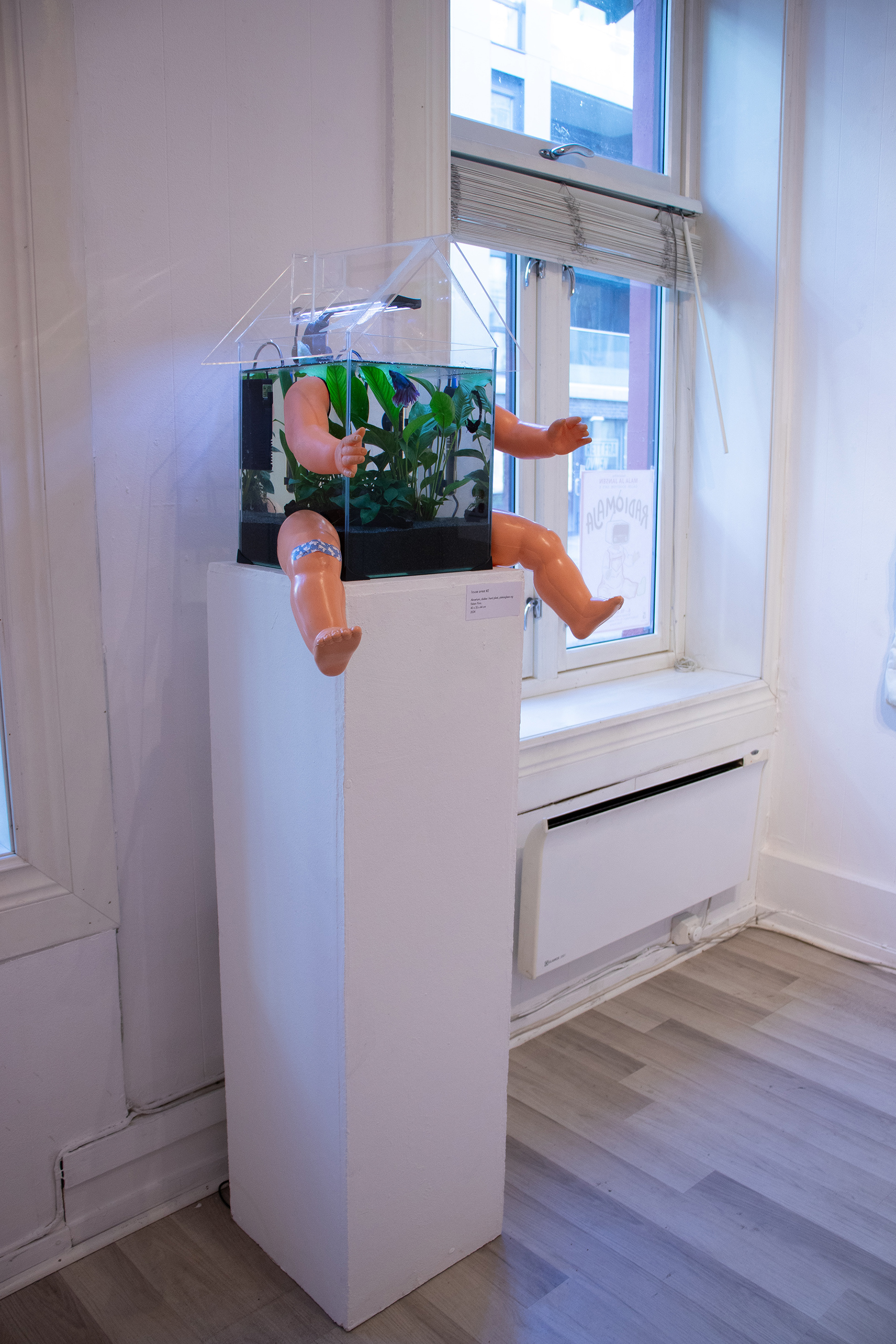 2024. Akvarium, dukke i hard plast, pleksiglass og fisken Finn. 40 x 35 x 44 cm