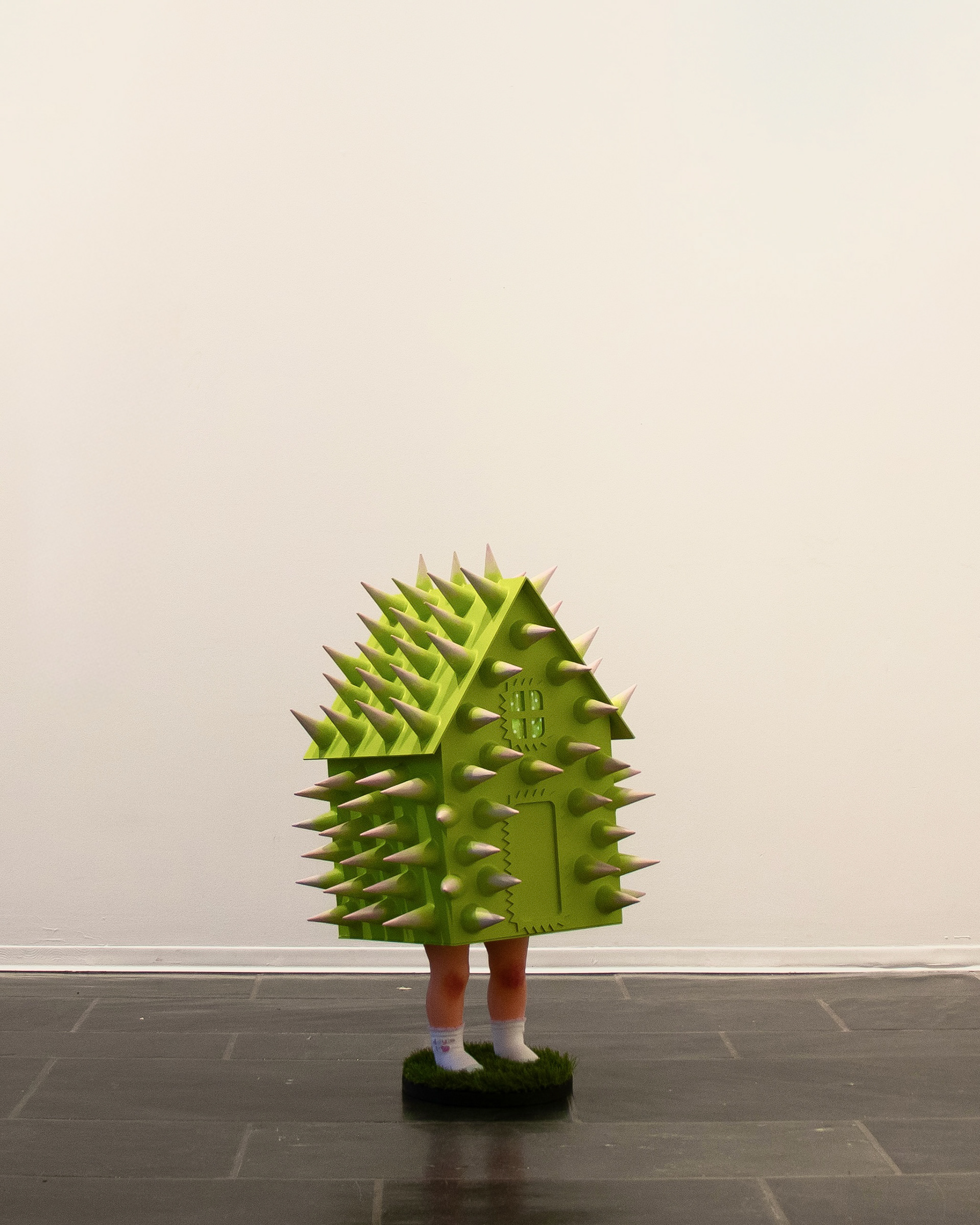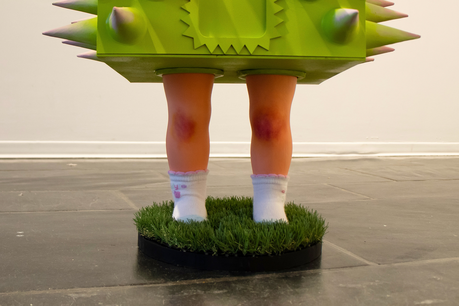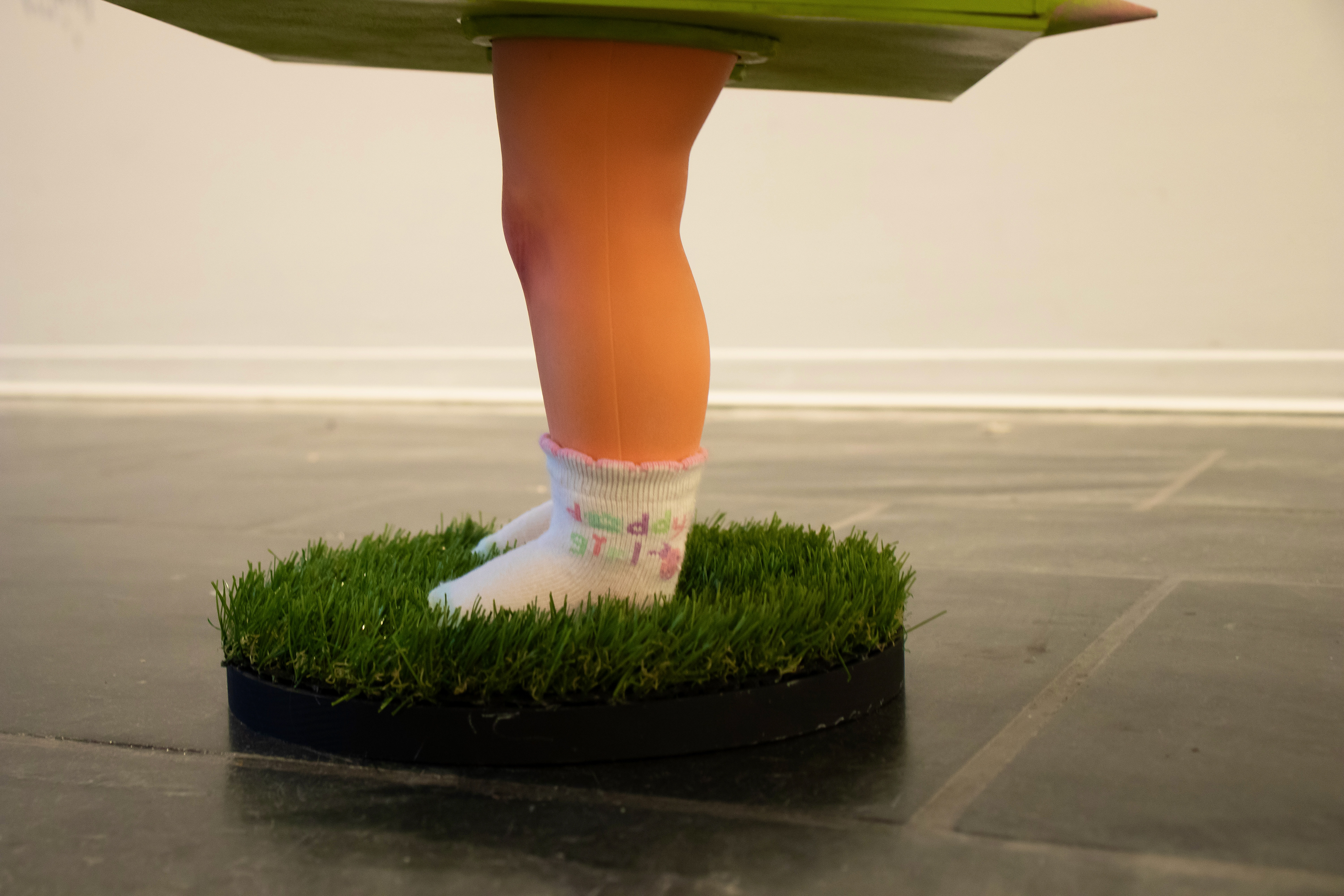 2025. MDF, dukke, pappkjegler, treplate, kunstgress, sokker og akrylmaling. 40 x 40 x 75 cm.
