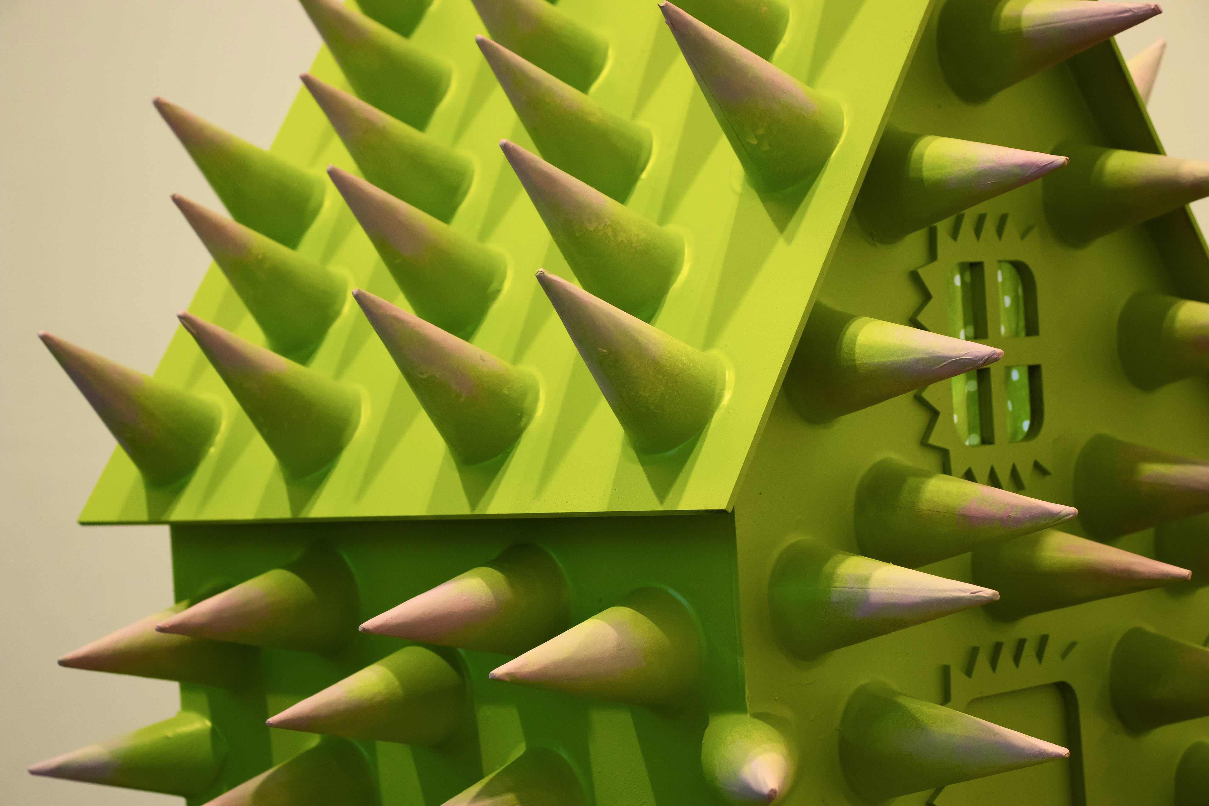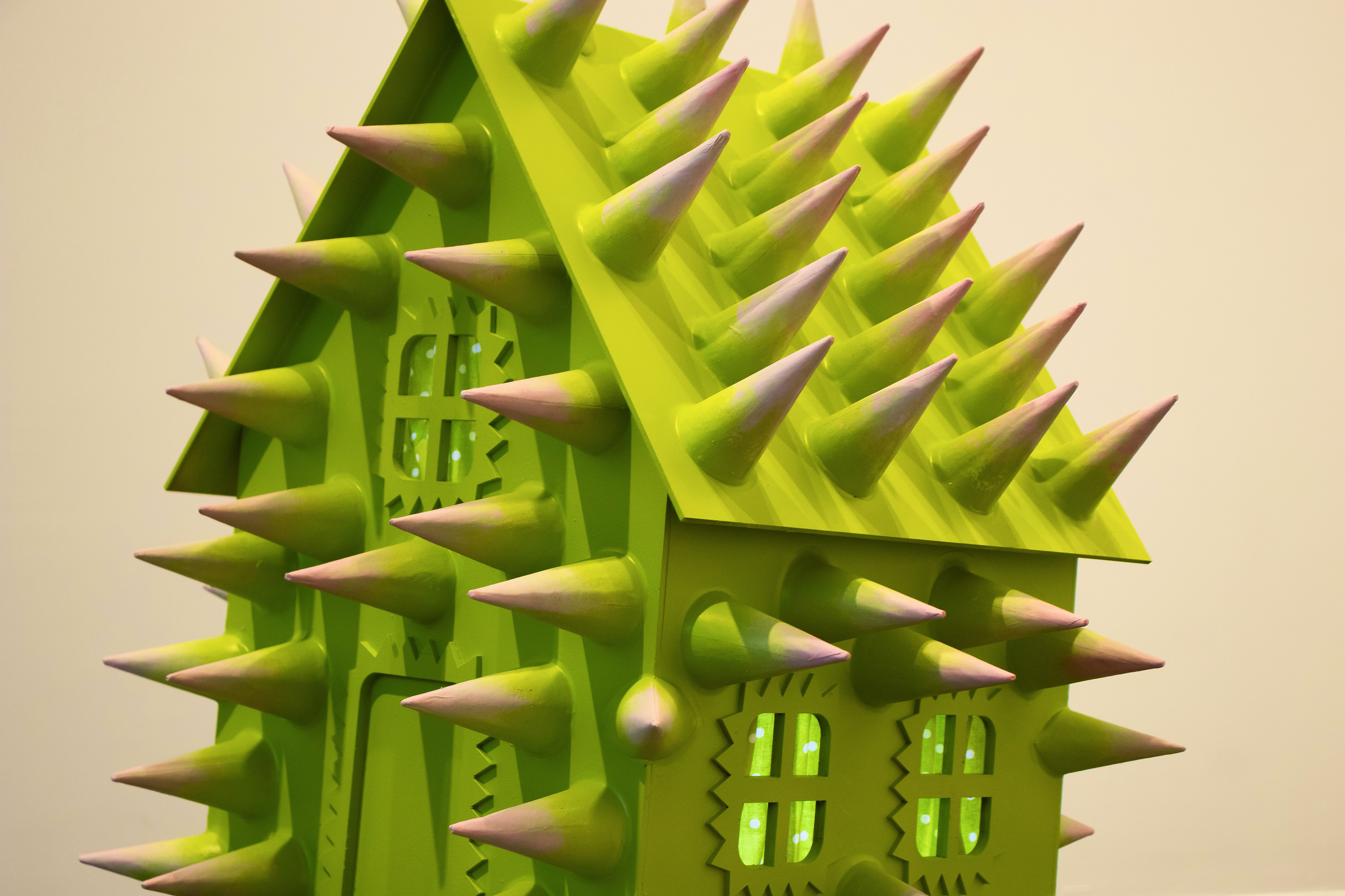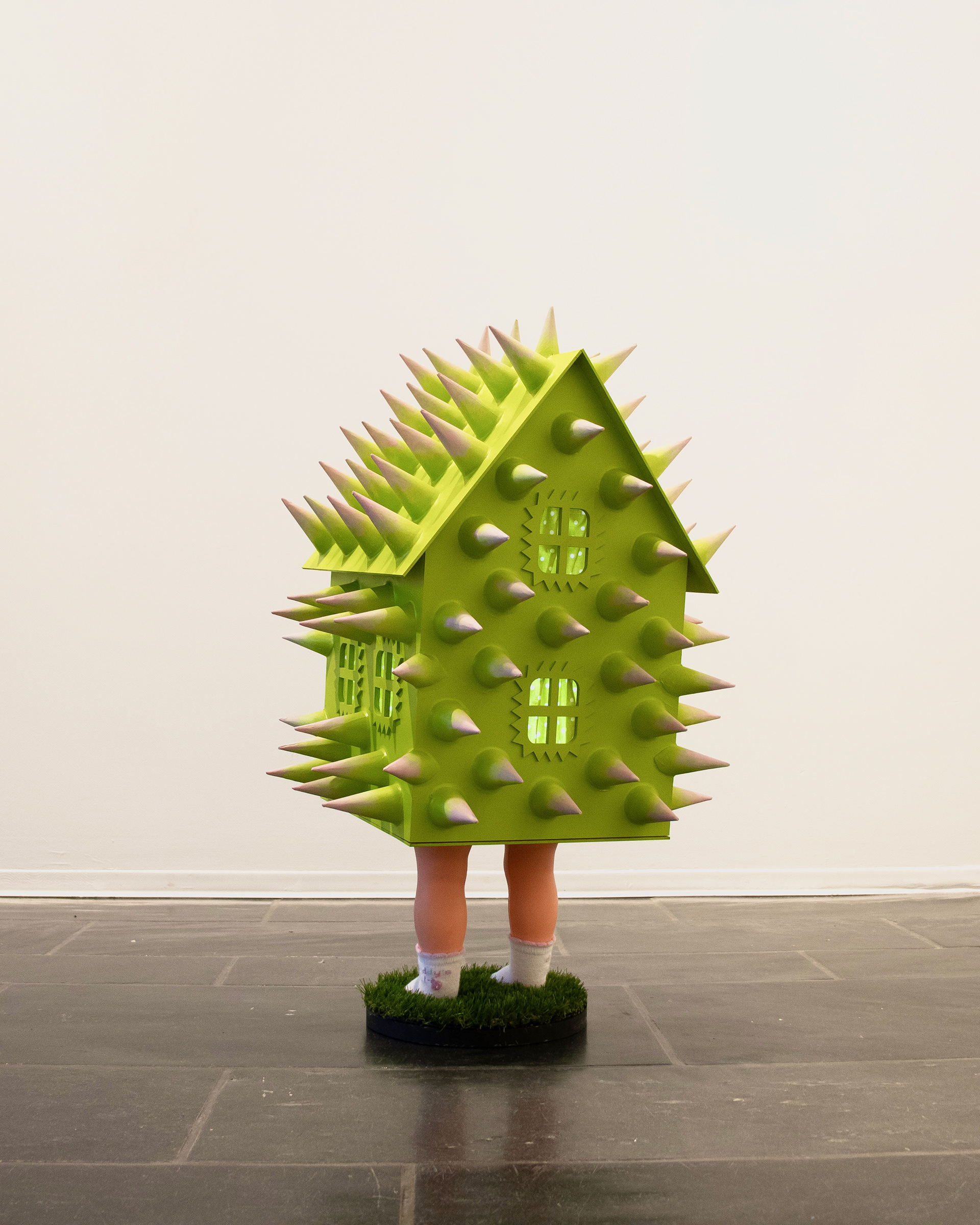 2025. MDF, dukke, pappkjegler, treplate, kunstgress, sokker og akrylmaling. 40 x 40 x 75 cm.