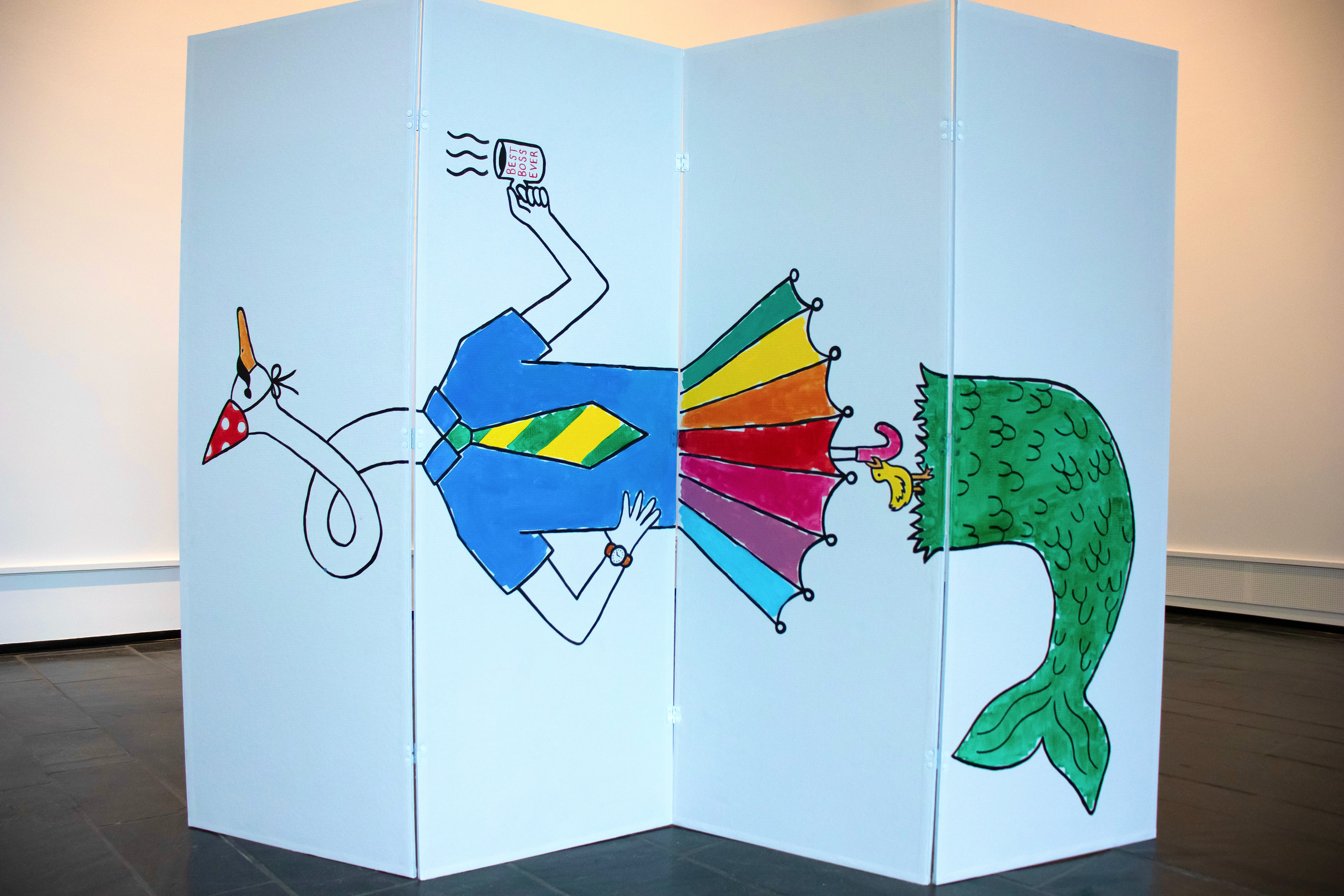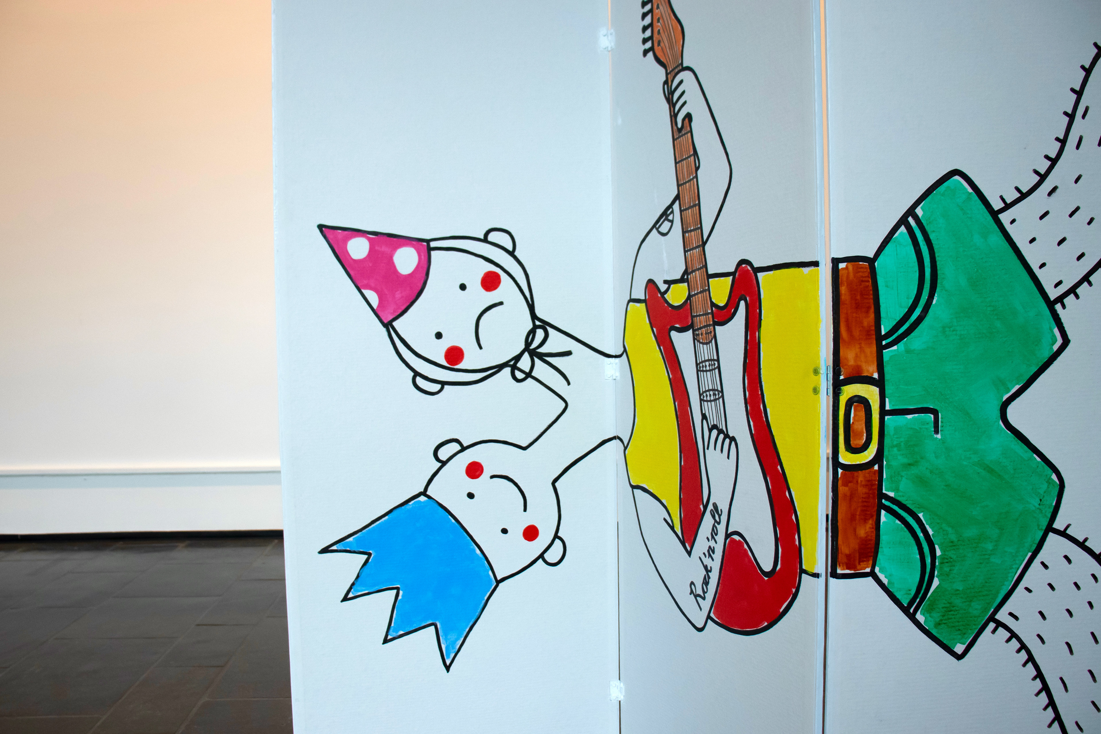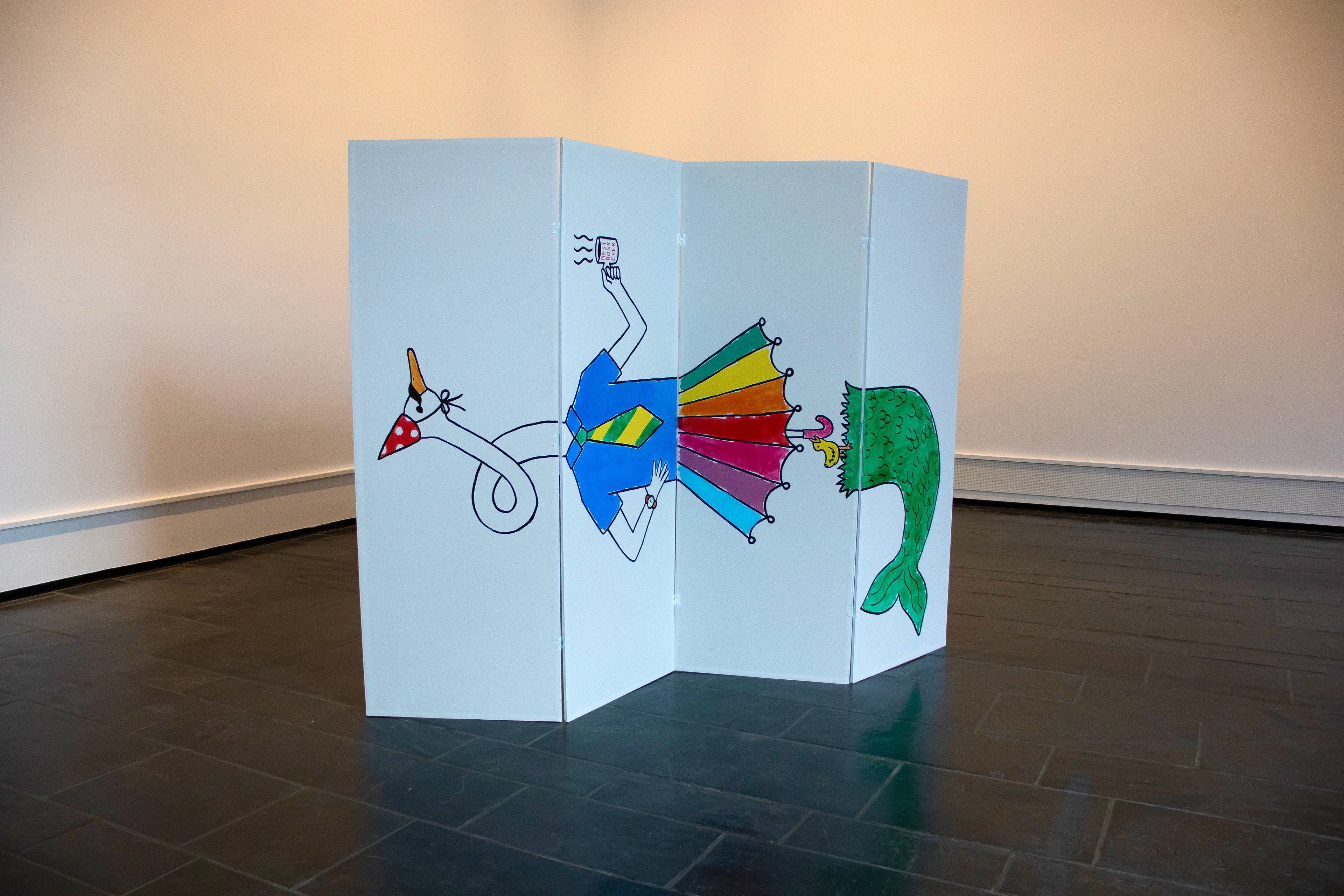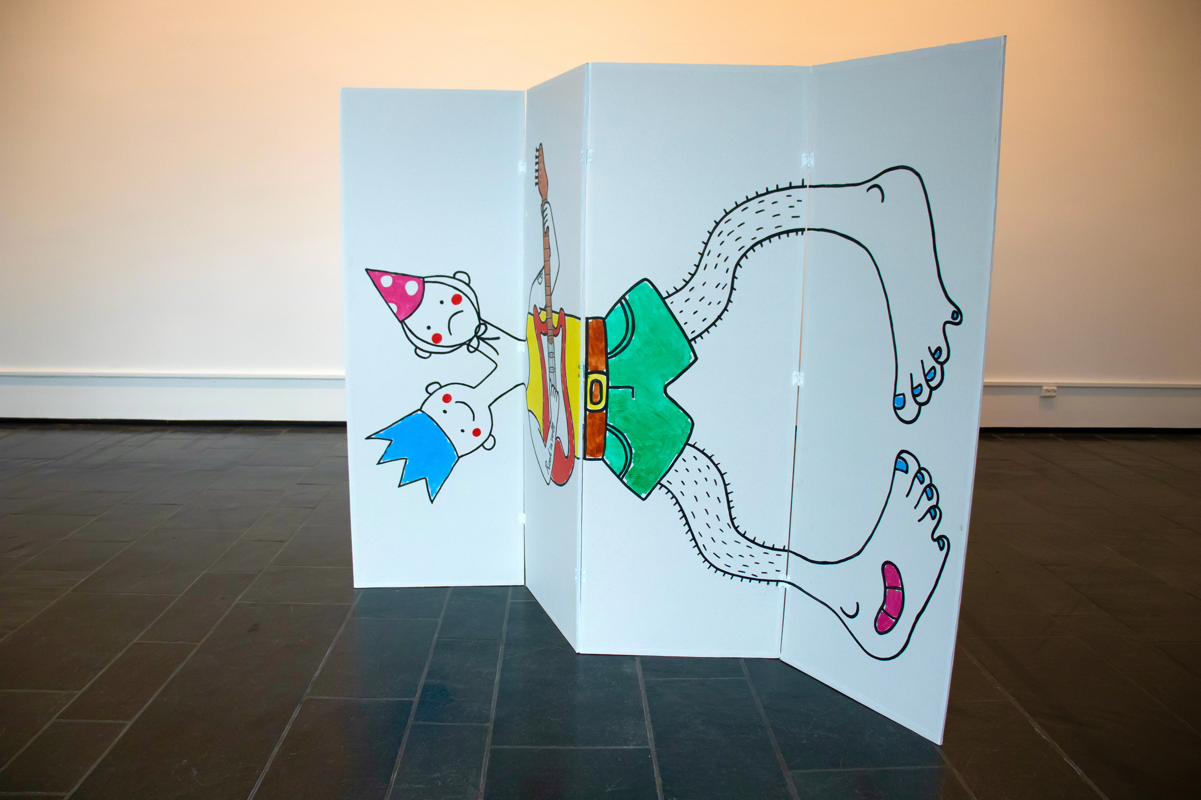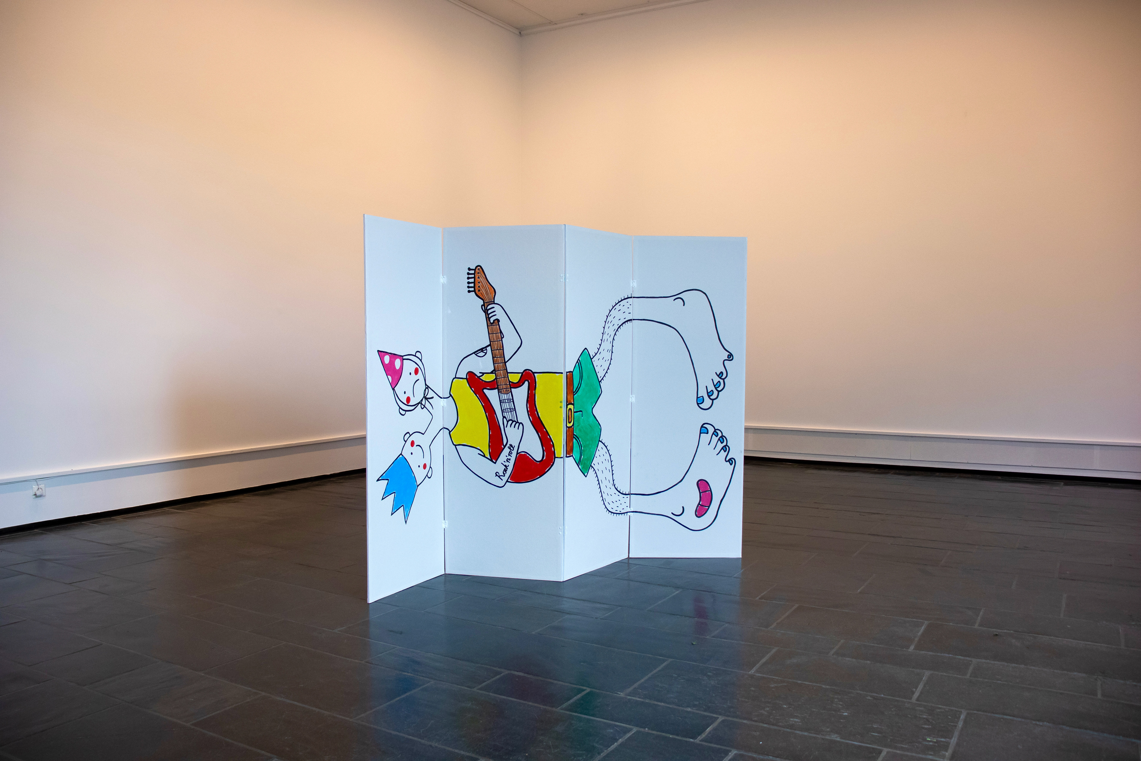 2024. Installasjon av våtromsplater, tapet, akryl- maling og hengsler. 170 x 220 cm.